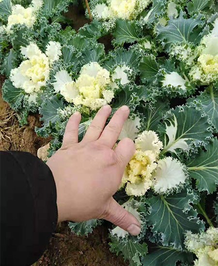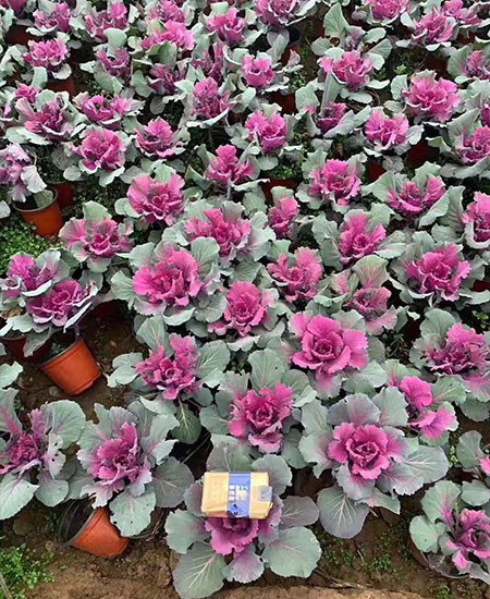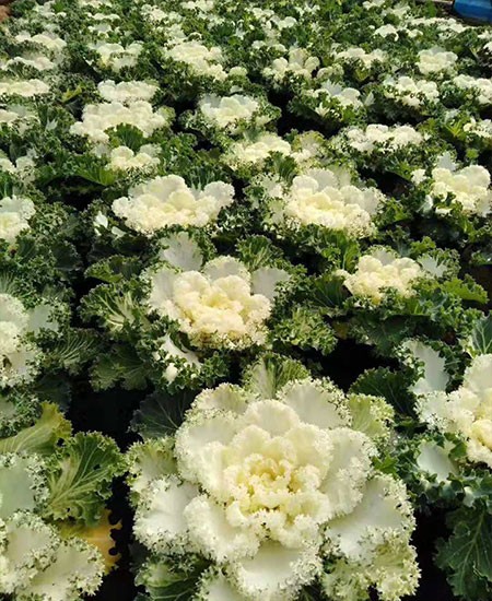 羽衣甘藍(lán)(學(xué)名:Brassica oleracea var. acephala DC.)是十字花科蕓苔屬植物,為二年生觀葉草本花卉,為甘藍(lán)的園藝變種?;~片緊密互生呈蓮座狀,葉片有光葉、皺葉、裂葉、波浪葉之分,葉脈和葉柄呈淺紫色,葉葉色豐富,有黃、白、粉紅、紅、玫瑰紅、紫紅、青灰、雜色等。葉片的觀賞期為12月至翌年3、4月份。株高一般為20-40厘米,總狀花序,花淺黃色。果實(shí)為角果,6月份種子成熟,種子黑褐色扁球形。 [1] 中國(guó)大城市公園有栽培。 [2] 喜冷涼氣候,適宜生長(zhǎng)發(fā)育的適溫為20-25℃,耐寒,能忍受多次短暫的霜凍而不枯萎,抗高溫能力達(dá)35℃以上,轉(zhuǎn)色需有15℃左右的低溫刺激;喜陽(yáng)光,對(duì)土壤的適應(yīng)性很強(qiáng)。 [3] 葉片形態(tài)美觀多変,心葉色彩絢麗如花,整株酷似一朵盛開(kāi)的牡丹花,人們形象地稱(chēng)之為“葉牡丹”。又因其喜冷涼氣候,較耐寒,可忍受多次短暫的霜凍,在百花凋零的冬季和早春,是布置露地花壇、花臺(tái)及盆栽陳設(shè)美化用材。