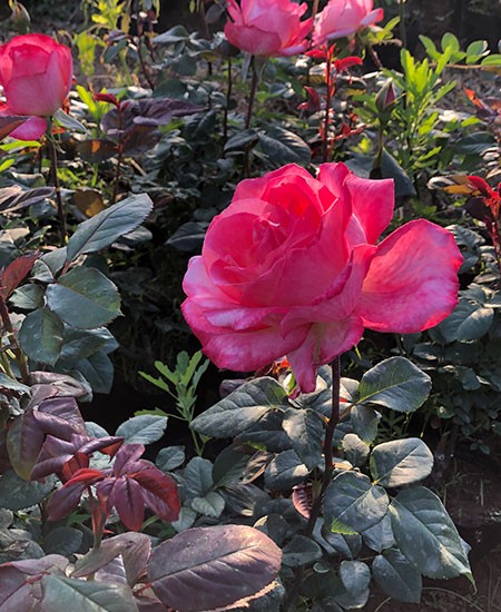 常綠或半常綠攀援灌木,有長匍匐枝,有散生而粗短鉤狀皮刺。小葉5-9,連葉柄長5-10厘米;小葉片橢圓形、卵形或長圓卵形,長2-7厘米,寬1.5-3厘米,先端急尖或漸尖,稀尾狀漸尖,基部楔形或近圓形,邊緣有緊貼的銳鋸齒,,革質(zhì);托葉大部貼生于葉柄,邊緣或在基部有腺,頂小葉片有長柄,總?cè)~柄和小葉柄有稀疏小皮刺和腺毛?;▎紊?-3朵,直徑5-8厘米;花梗長2-3厘米,或有腺毛;萼片全緣,少數(shù)羽狀裂片,披針形,先端長漸尖,內(nèi)面密被長柔毛;花瓣芳香,白色或帶粉紅色,倒卵形;心皮多數(shù),被毛;花柱離生,伸出花托口外,約與雄蕊等長。果實呈壓扁的球形,稀梨形,果梗短。花期6-9月。