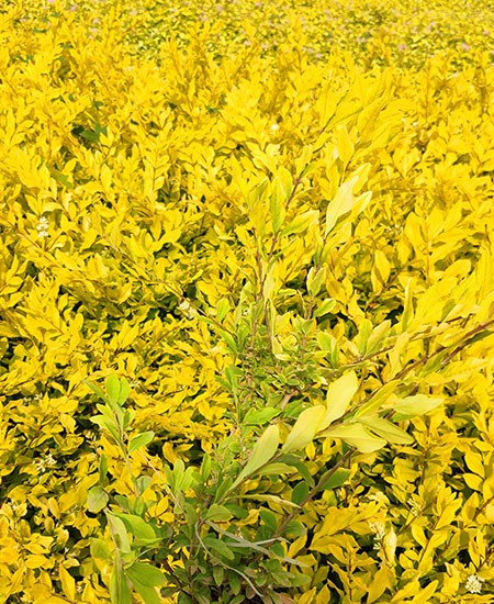 金葉女貞是美國加州的金邊女貞與歐洲女貞樹種雜交而成。落葉灌木,株高2-3米。其嫩枝帶有短毛。葉革薄質(zhì),單葉對生,橢圓形或卵狀橢圓形,先端尖,基部楔形,全緣。新葉金黃色,因此得名為金葉女貞,老葉黃綠色至綠色。總狀花序,花為兩性,呈筒狀白色小花;核果橢圓形,內(nèi)含一粒種子,顏色為黑紫色。花期5-6月,果期10月。