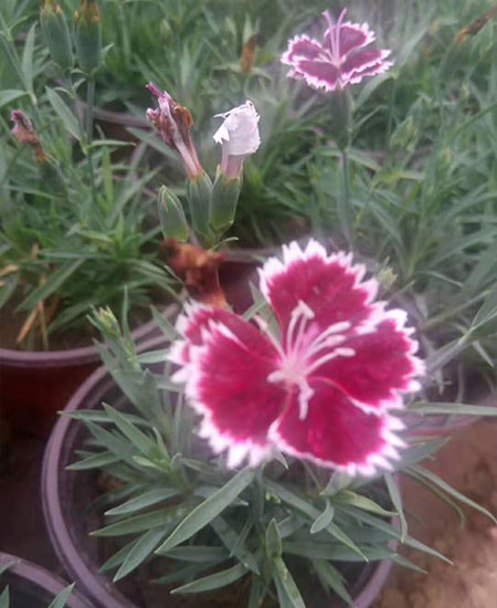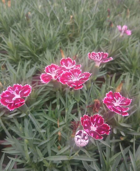 彩虹石竹為多年生常綠草本植物。花期為四月至十二月,花色為復(fù)式花,葉片呈現(xiàn)銀灰色冬天艷亮是觀花觀葉的雙優(yōu)品種。其耐43度高溫、耐零下20度低溫,喜光、耐干旱、耐瘠薄。多年生草本,高30-50厘米,全株無毛,帶粉綠色。莖由根頸生出,疏叢生,直立,上部分枝。葉片線狀披針形,長3-5厘米,寬2-4毫米,花單生枝端或數(shù)花集成聚傘花序;花梗長1-3厘米;苞片4,卵形,長達花萼1/2以上,邊緣膜質(zhì),有緣毛。